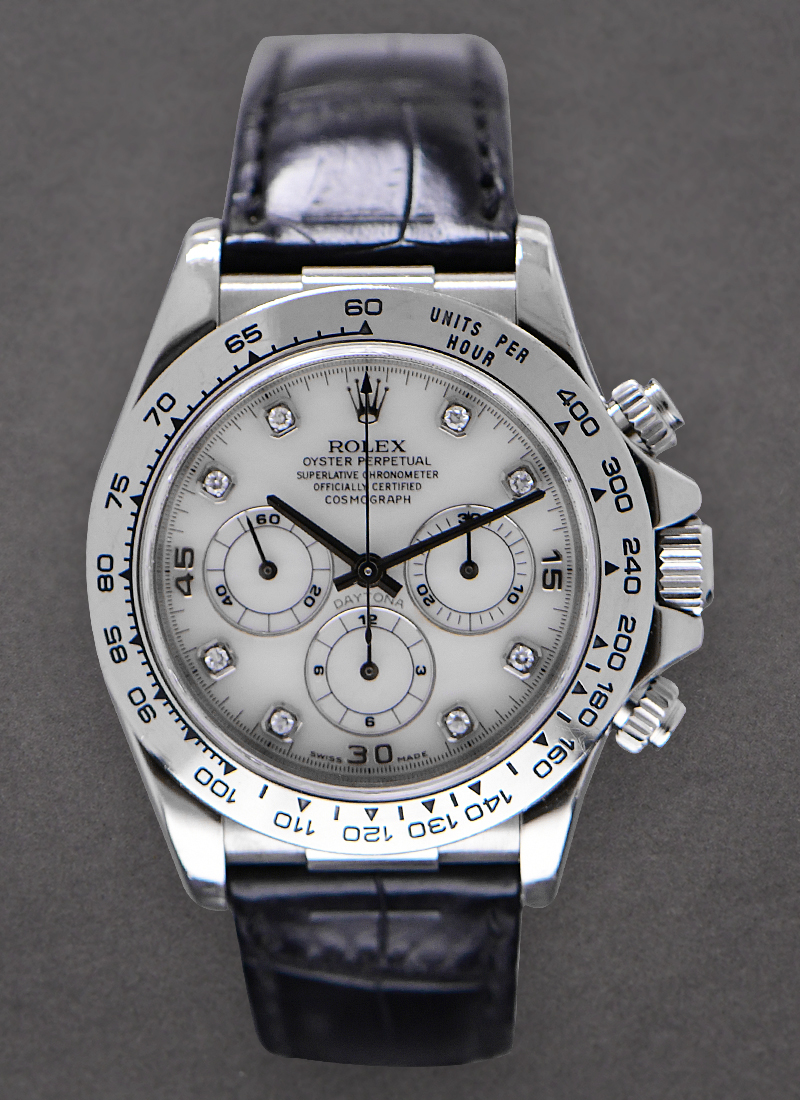 Daytona White Gold on Strap 16519 with White Mother of Pearl Diamond Dial 16519