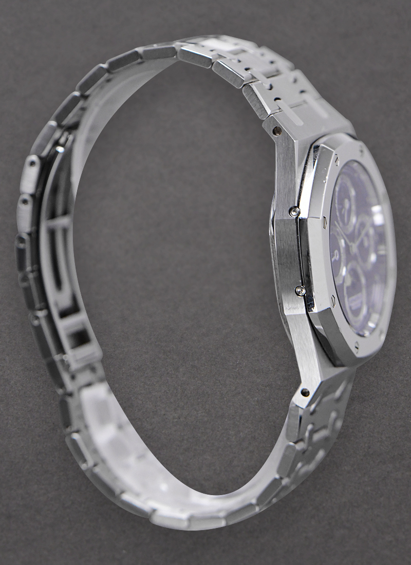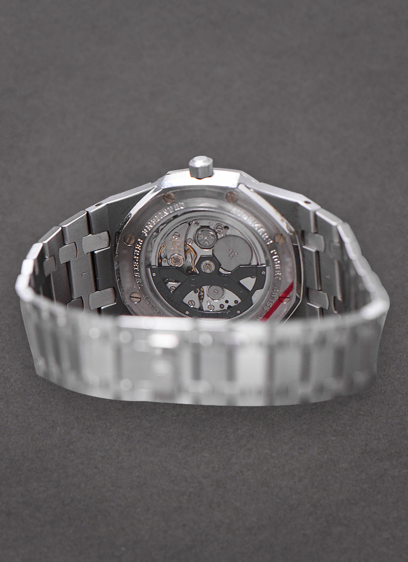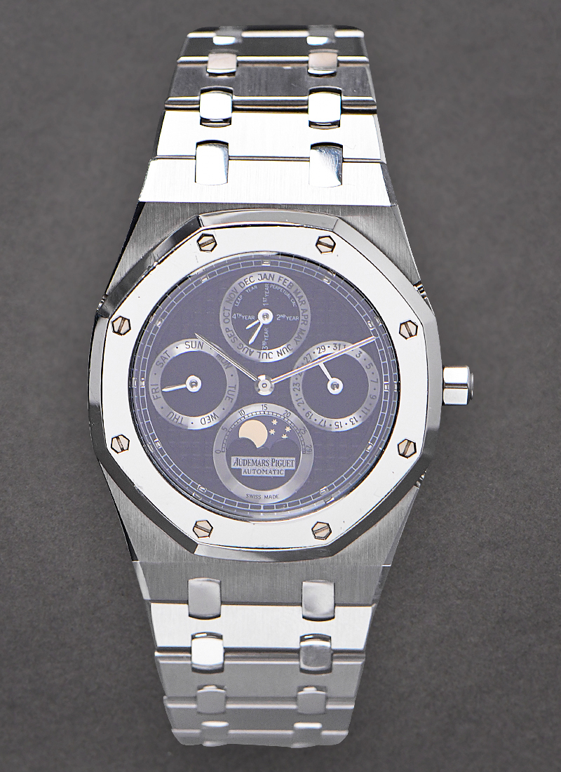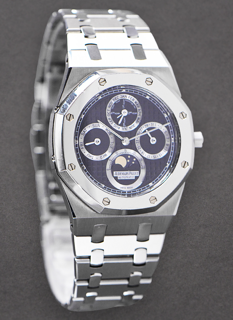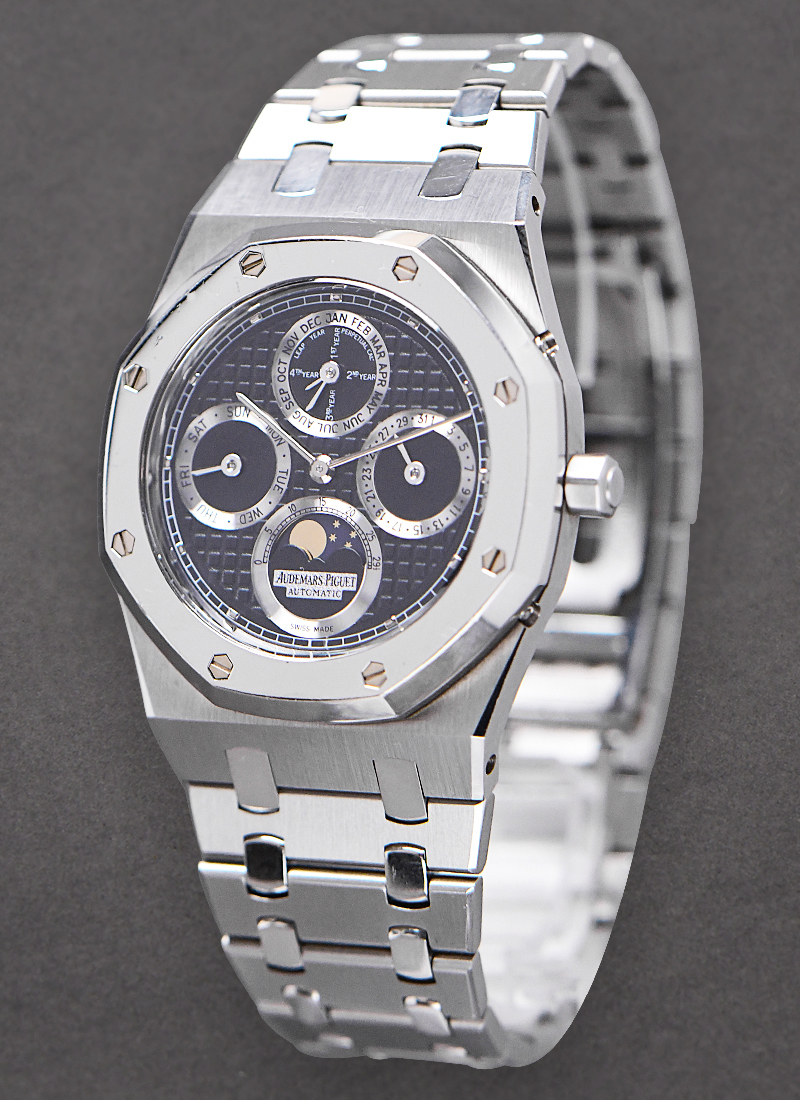 This Audemars Piguet Royal Oak Selfwinding Perpetual Calendar in stainless steel features a 39mm case, black checkered dial, and a steel bracelet. The Audemars Piguet Royal Oak Selfwinding Perpetual Calendar also features an automatic movement with perpetual calendar indicating day, date, month, moon phase and leap years. This watch is water resistant to 20 meters.