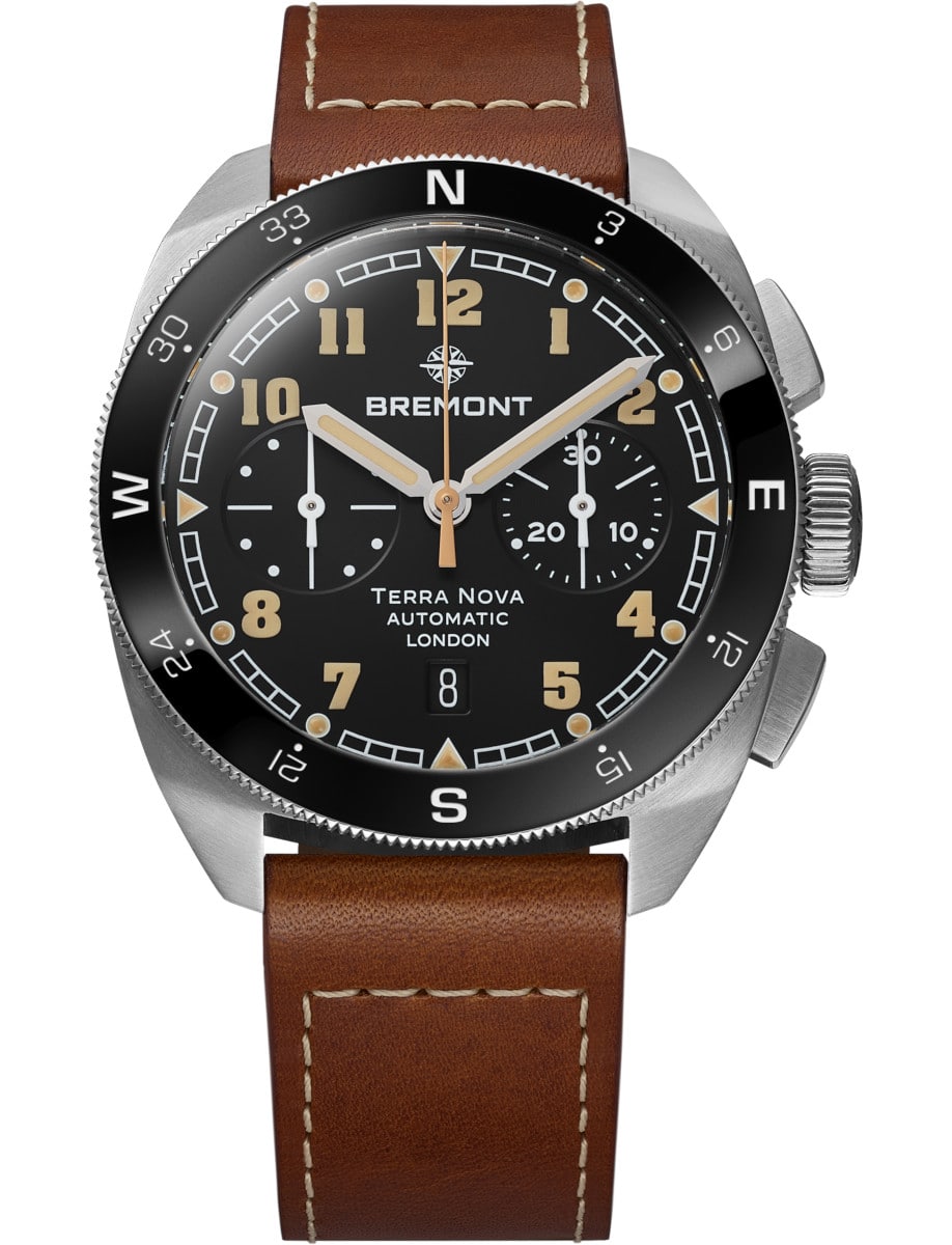 Terra Nova 42.5 Chronograph in Steel with Black Ceramic Bezel on Black Leather Strap with Black Dial TN42 CHR SS BK L S