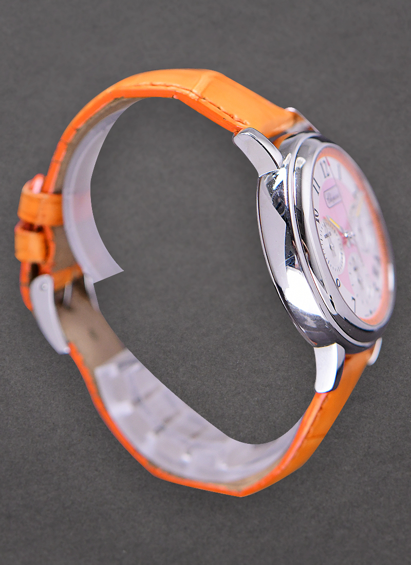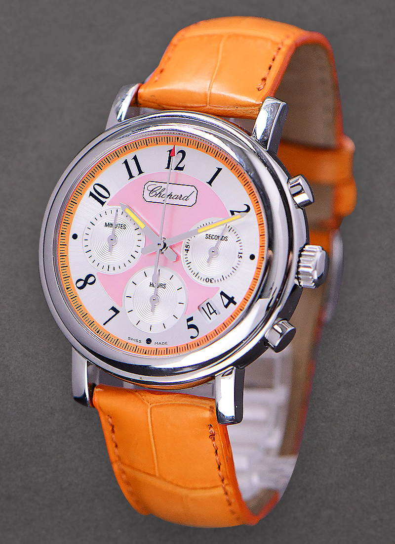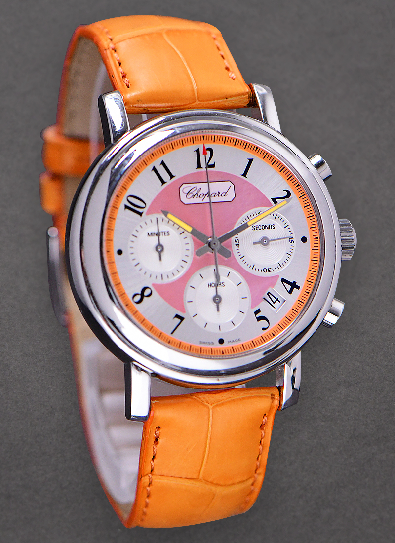 The Chopard Elton John Mille Miglia Chronograph Steel on Orange Strap with Orange Dial is an astonishing brightly colored watch with chronograph functions. Chopard always impress the world of horology with its innovative and trendsetting designs this time in a carrot colored façade. The Chopard Elton John Mille Miglia Chronograph Steel on Orange Strap with Orange Dial is made of stainless steel material in a large round case of 38mm. it has a fix smooth bezel and a scratch resistant sapphire crystal covering a colorful and full of function face. It has an orange dial to match the color of the bracelet and orange tipped hour and minute hands. The Arabic numerals in black acts as hour markers with three second sub-dials in white scattered on the watch. The Chopard Elton John Mille Miglia Chronograph Steel on Orange Strap with Orange Dial has chronograph and date functions with the time setting crown in between two push buttons. Equipped with and automatic movement and a much higher water depth resistance of up to 165 feet the Chopard Elton John Mille Miglia Chronograph Steel on Orange Strap with Orange Dial in orange colored leather straps with tang buckle is a legitimate attention grabber, designed and made to impress even the most discriminating of tastes.