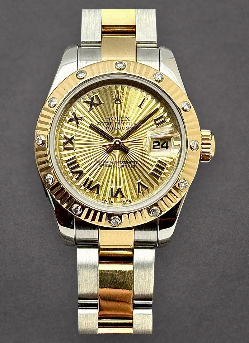 Datejust Lady's in Steel with Yellow Gold 12 Diamond Bezel on Oyster Bracelet with Champagne Sunbeam Roman Dial 179313