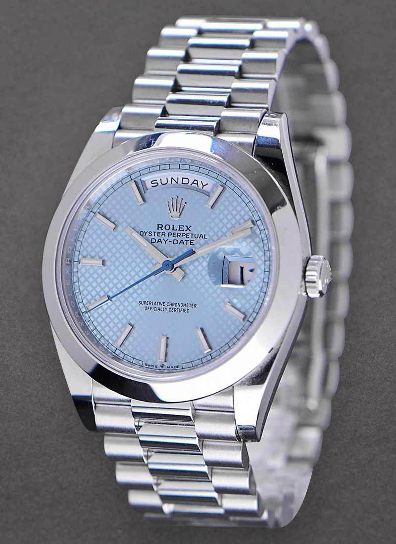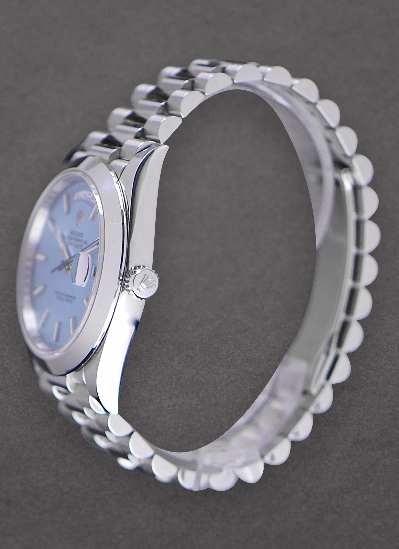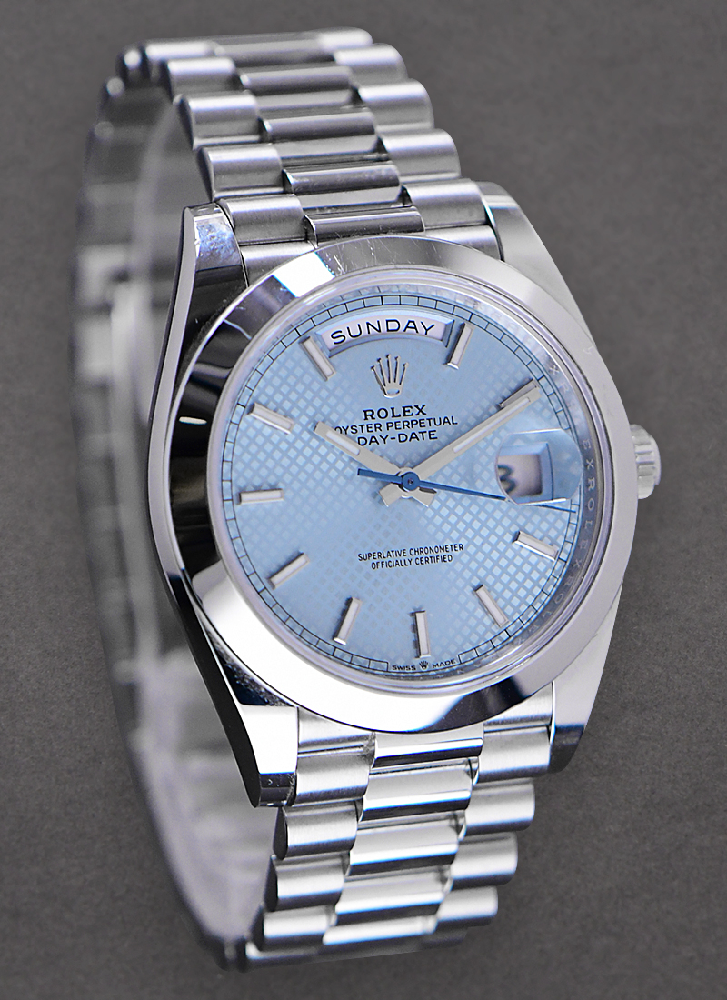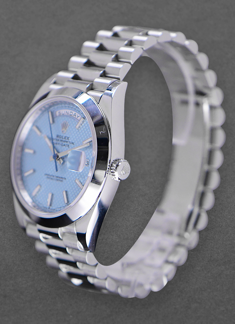 Day Date 40mm in Platinum with Smooth Bezel on President Bracelet with Ice Blue Diagonal Motif Dial 228206
