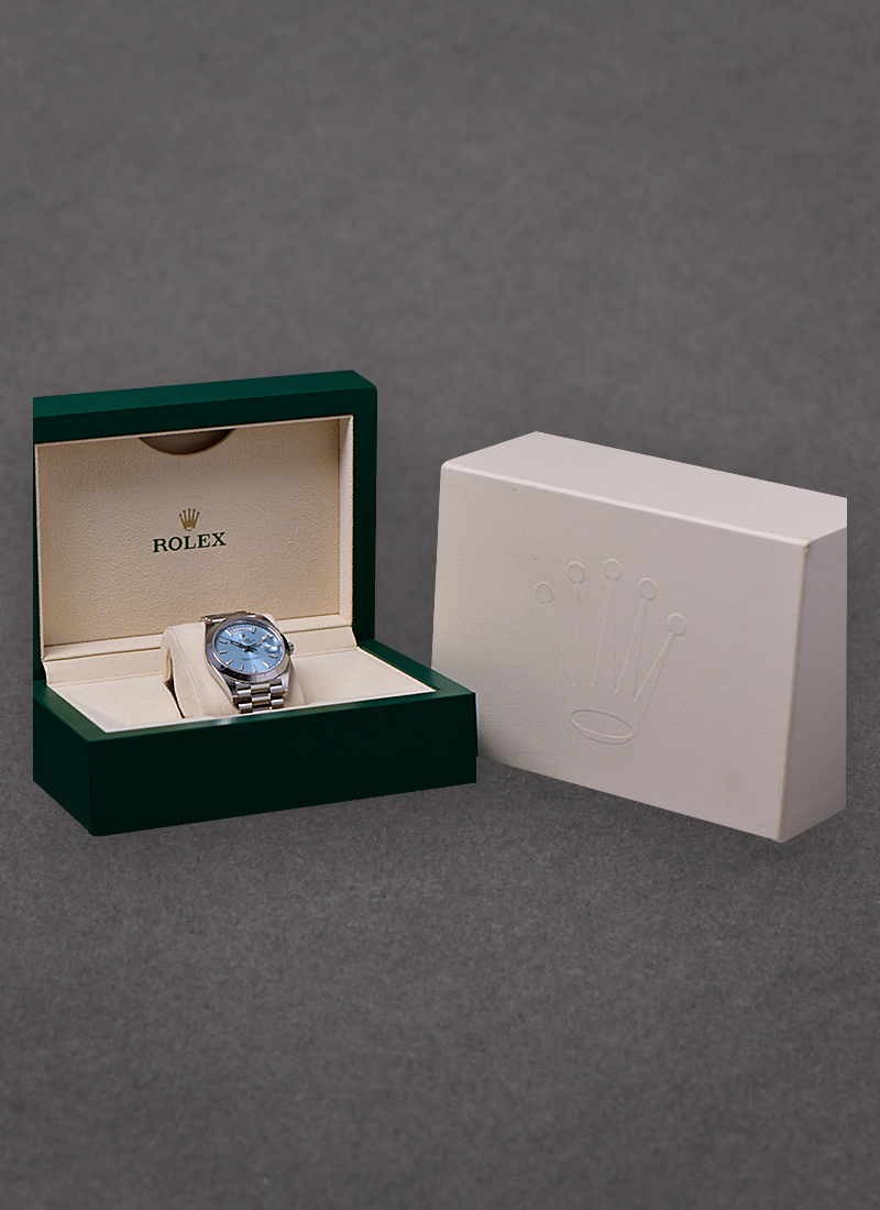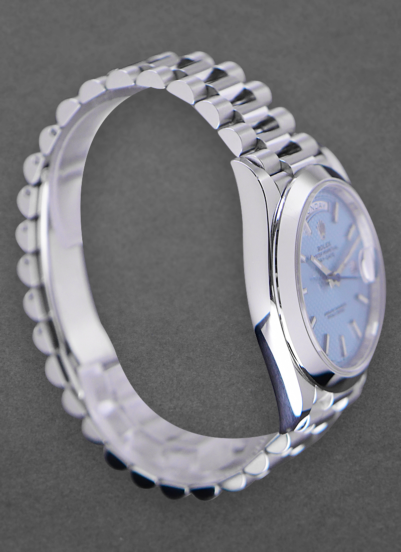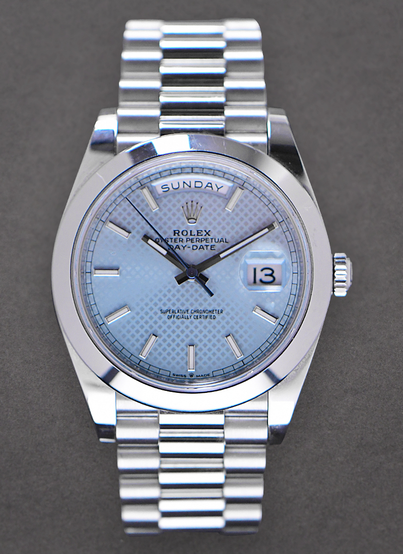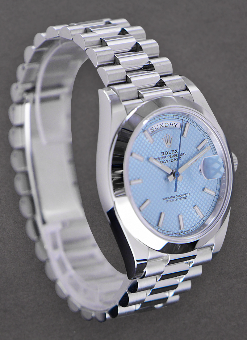 Day Date 40mm in Platinum with Smooth Bezel on President Bracelet with Ice Blue Diagonal Motif Dial 228206